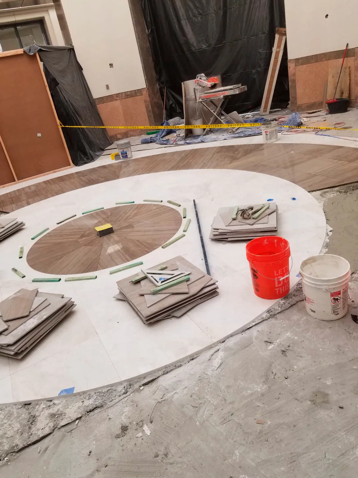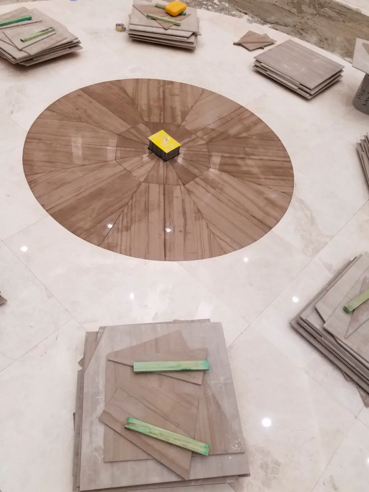 We used two different types of marble (ivory cream and limestone dark) and we had to be extremely precise to achieve that the circle at the heart of the lobby perfectly matched -both in size and location- with the blueprints and the furniture that was custom made for that area.